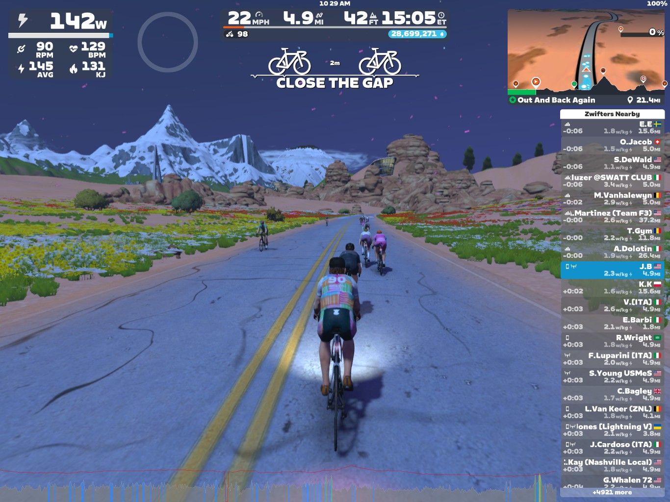 A cyclist rides along a virtual road in Zwift, with mountains in the background and a scenic landscape. The cyclist's speed and performance metrics are displayed on the screen, showing a speed of 21 mph and a distance of 6.2 miles. Other nearby riders' names and stats are visible on the right side of the image.