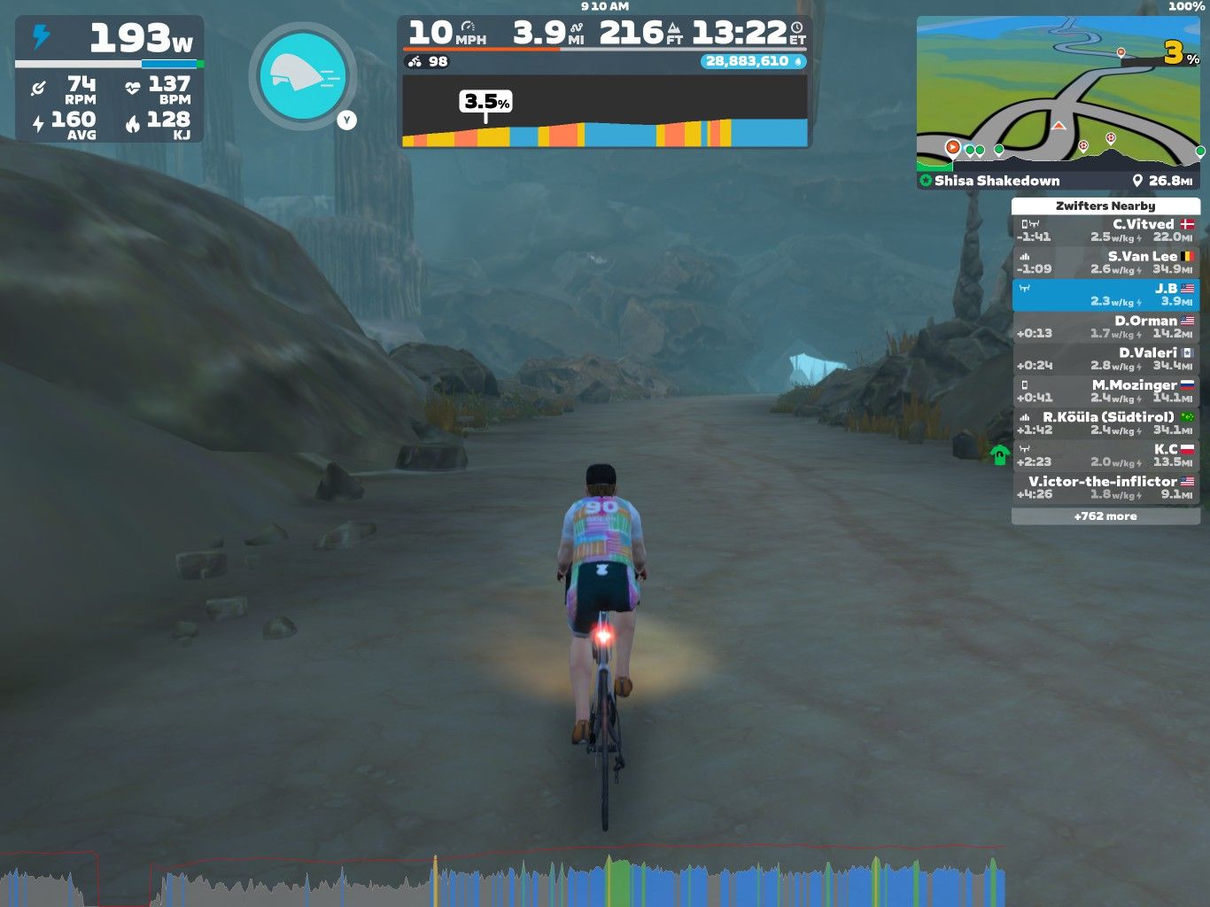 A cyclist rides on a virtual path in Zwift, surrounded by rocky terrain and a misty atmosphere. The screen displays performance metrics, including speed (10 mph), distance (3.9 miles), and elevation (216 ft), along with nearby cyclists' details on the side.