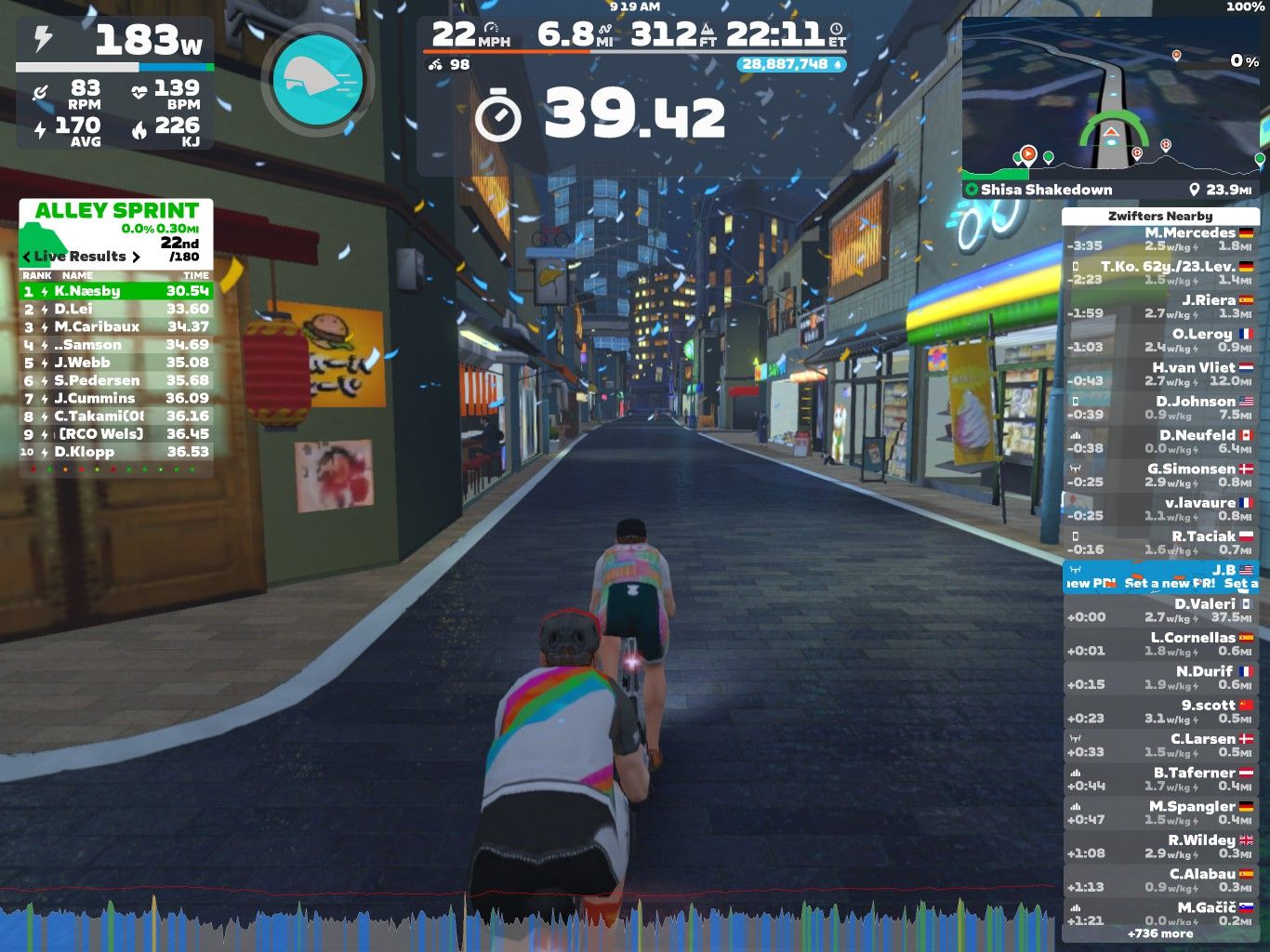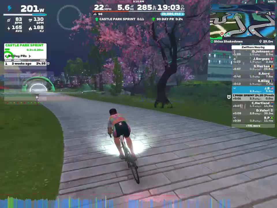 A cyclist is riding on a virtual path in Zwift, surrounded by pink flowering trees. The screen displays various performance metrics, including power output (201 W), speed (22 mph), and distance (5.6 miles). Nearby rider information is also shown, along with a map of the course. The scene is set in a vibrant, illuminated environment, suggesting a dynamic virtual cycling experience.