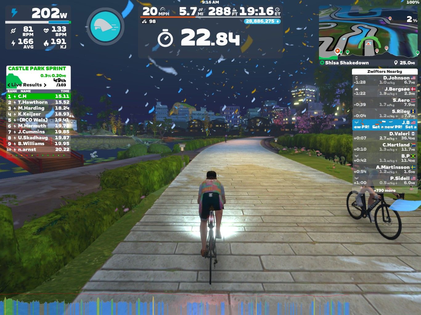 A cyclist rides along a paved path in a virtual landscape within the Zwift platform. The scene is set at night with colorful lights and buildings in the background. The cyclist is focused on racing, with various performance statistics displayed, including power output, speed, and race results for the