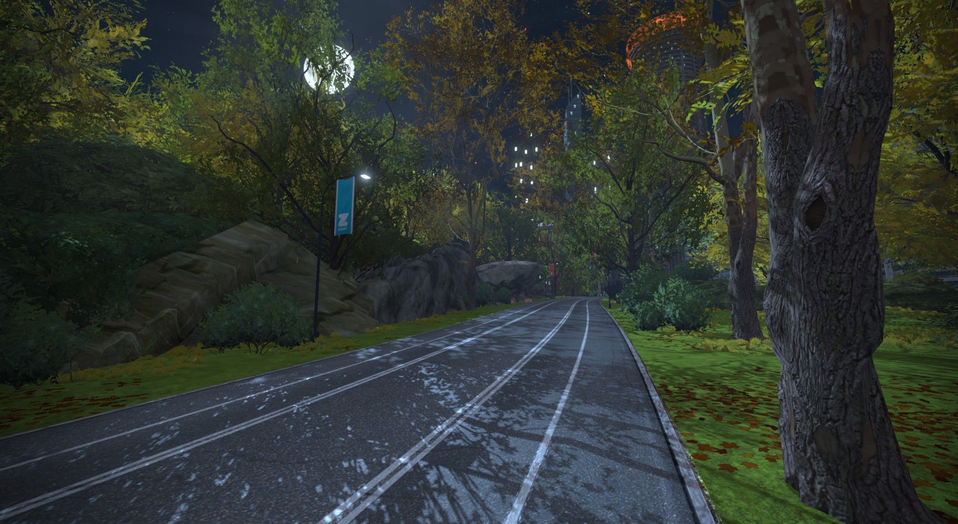 A winding path in a lush, green park is illuminated by soft lighting at night, flanked by trees with autumn foliage. A few large rocks are visible alongside the path, and a flag with the Zwift logo can be seen on a nearby pole.