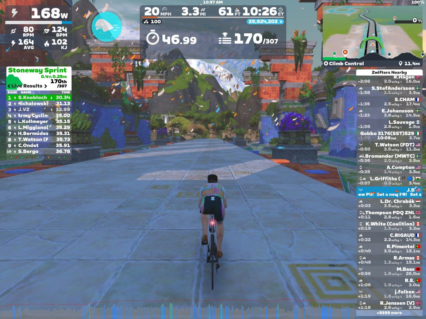 A cyclist rides on a virtual course in Zwift, surrounded by colorful digital landscapes. The screen displays performance stats, including wattage, speed, and heart rate, as well as live results of a sprint competition and nearby riders.